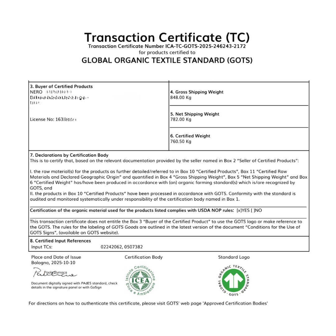 Certified by the Global Organic Textile Standard (GOTS), the world’s strictest standard for organic fibres. Less than 1% of the world’s cotton meets this level of purity.